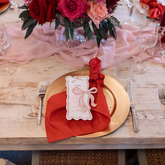 Draped in soft pink fabric, it exuded an effortless, ethereal charm. Single-stemmed roses lined the tabletop, accompanied by tall, colored dinner candles that cast a warm, intimate glow. Adding a whimsical touch, delicate trendy bows hung from the bud vases, cascading gracefully down the front of the table.